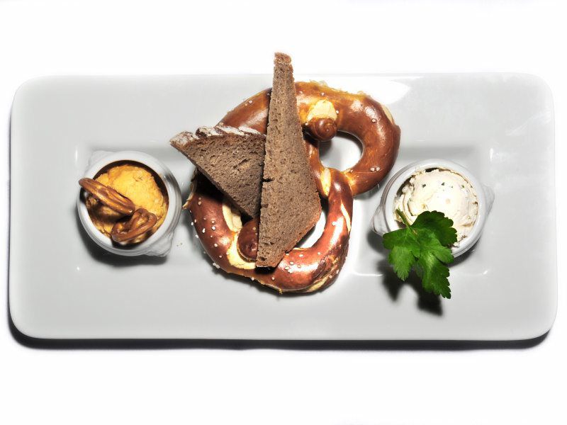 Obatzda und Radiserlfrischkäse (3) mit einer Brezn und Hausbrot und zusätzlich mit 2 scharfen Würschtl