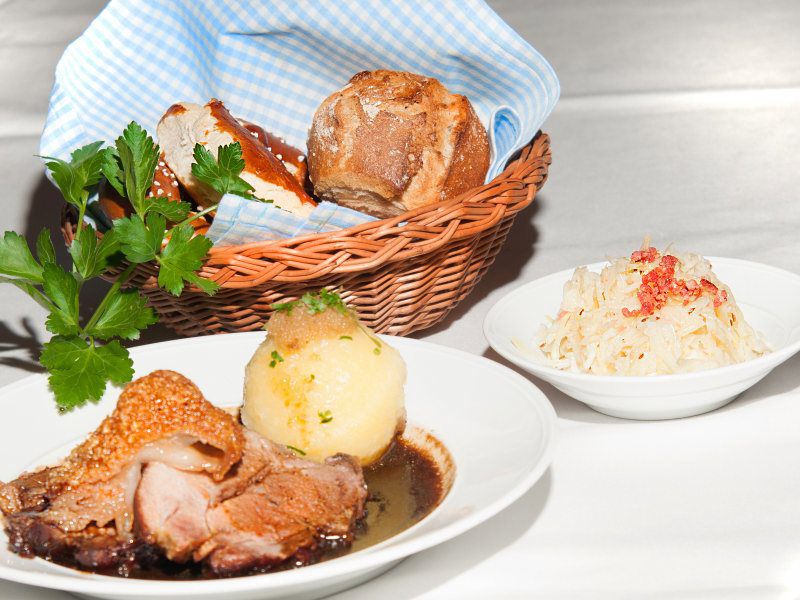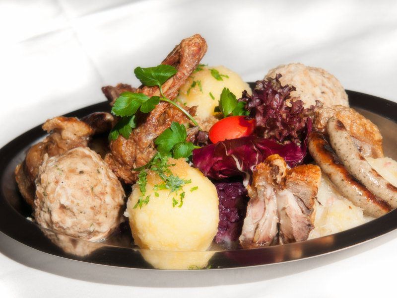 Gegrillte Schweinshaxe, gebratenes Schäufele (aus der Schweinsschulter mit Kruste), original Nürnberger Rostbratwürste und Wiener Schnitzel vom Kalb, dazu gibt es Kartoffelknödel (2,3), warmen Kartoffelsalat, frisches Sauerkraut mit Speck (2) und Apfelblaukraut (3)