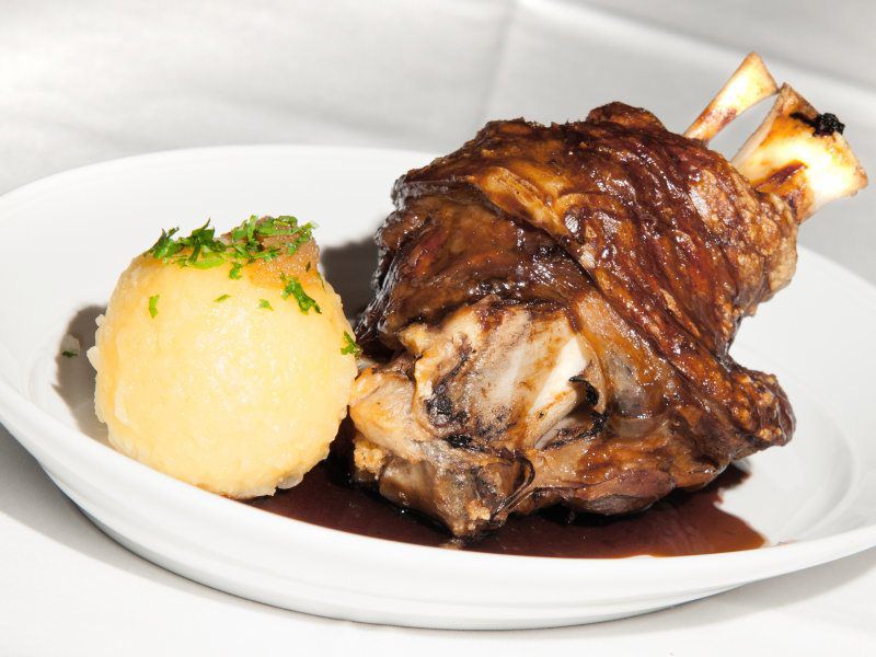aus der Haxe geschnitten mit Augustiner Dunkelbiersoße, Kartoffelknödel(2,3) und frischem Sauerkraut mit Speck(2)