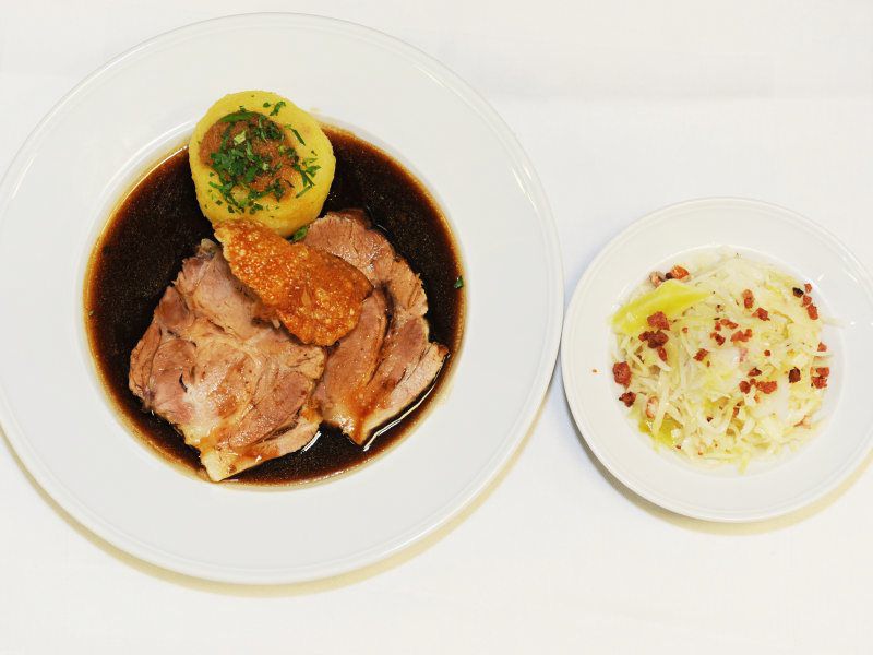 Kartoffelknödel(2,3), frischem Sauerkraut mit Speck (2), Apfelblaukraut(3) und Augustiner Dunkelbiersoße