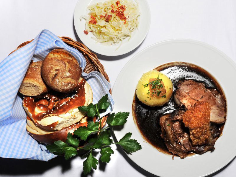 Gegrillte Schweinshaxe, gebratenes Schäufele (aus der Schweinsschulter mit Kruste), original Nürnberger Rostbratwürste und Wiener Schnitzel vom Kalb, dazu gibt es Kartoffelknödel (2,3), warmen Kartoffelsalat, frisches Sauerkraut mit Speck (2) und Apfelblaukraut (3)